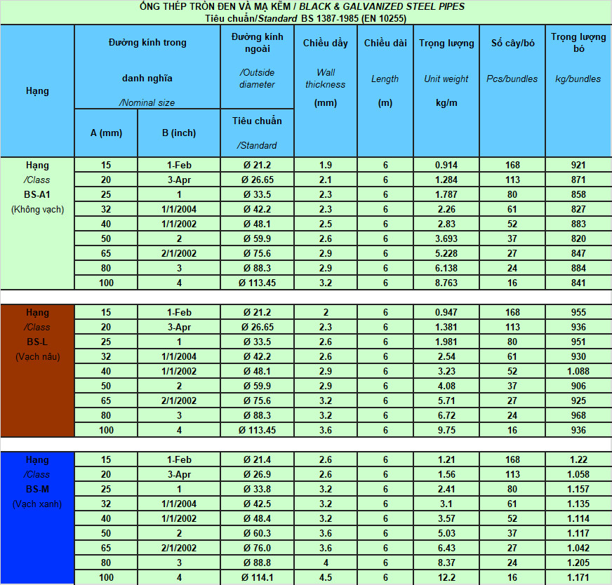 Kích thước: phi 12.9mm đến 127mm, dày 0.8mm đến 5.0mm. Tiêu chuẩn: Anh Quốc BS 1387-1985, BS 3601-1987 (replaced by BS EN 10217-1), Mỹ ASTM A53, Nhật JIS G3444, JIS G3452