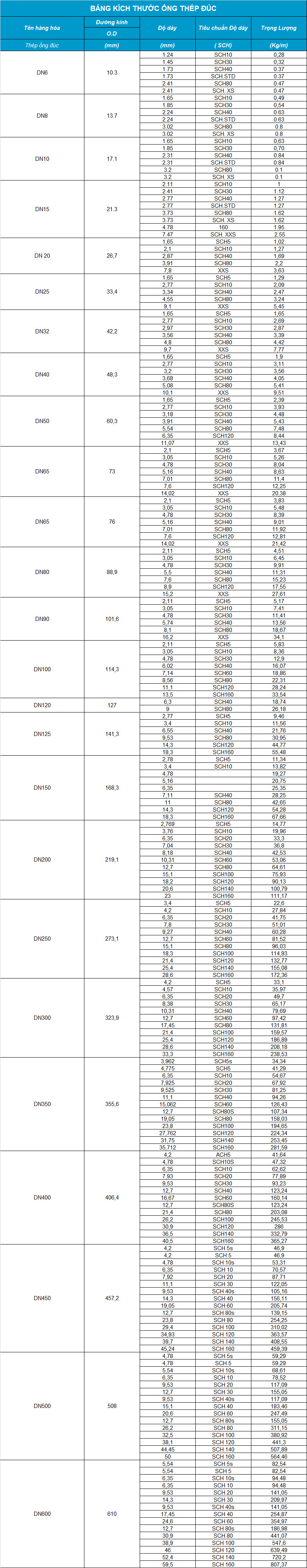 KÍCH THƯỚC ỐNG THÉP ĐÚC