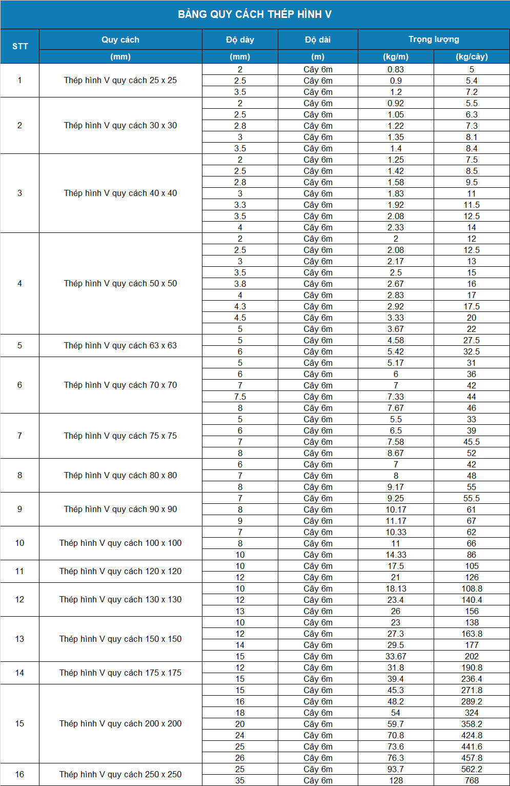 + Chiều dài thông thường của một cây thép hình V là 6m hoặc 12m.