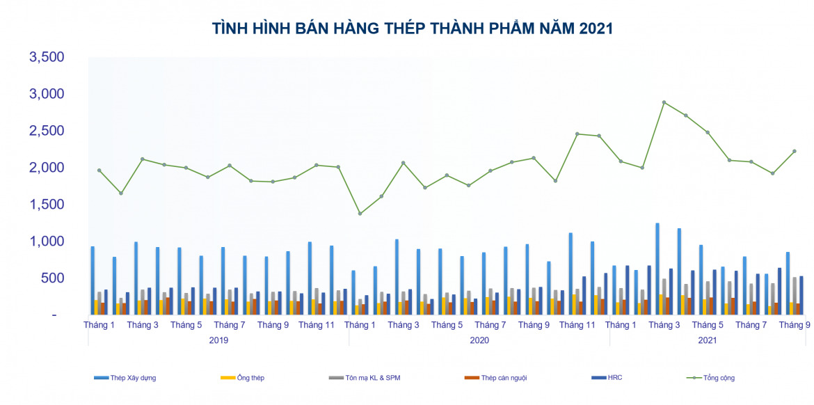 - Bán hàng thép các loại đạt 2,2 triệu tấn, tăng lần lượt 7,4% so với tháng trước, và 4,1% so với tháng 9/2020.